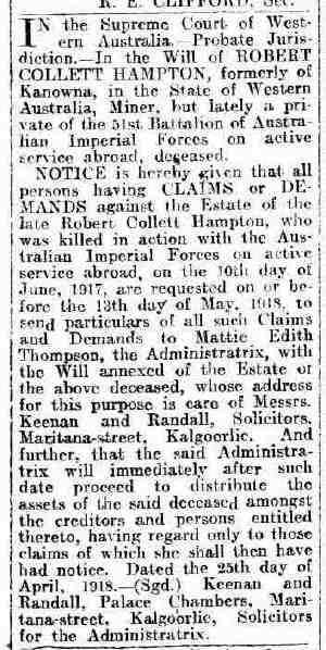16 Trove - National Library of Australia, "Australian Newspapers," database, <i>MyHeritage.com</i> (https://www.myheritage.com/research/collection-10450/australian-newspapers : accessed Nov 8, 2018), Will of ROBERT COLLETT HAMPTON; Kalgoorlie Miner (WA); 1918-04-29; Page: 2 Col 2; Public Notices.