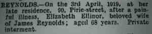 Elizabeth was living at 90 Pirie Street Mt. Victoria, Wellington, New Zealand in Apr 3, 1919 Elizabeth married James Reynolds in 1874 in New Zealand.1 2 |
